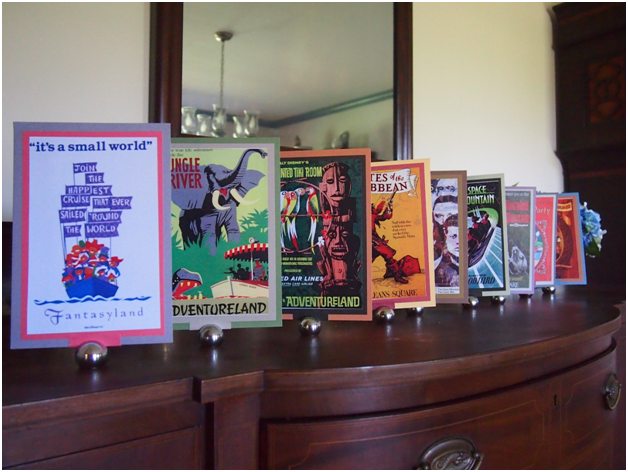 As a combination favor/placecard, we made mock Disney cast member name tags by printing a design on cardstock and gluing it to a plastic nametag purchased in bulk off the internet. The bottom of the nametag gave the “ride” at which table the guest was seated. Almost everyone got in the spirit by putting on their nametags!