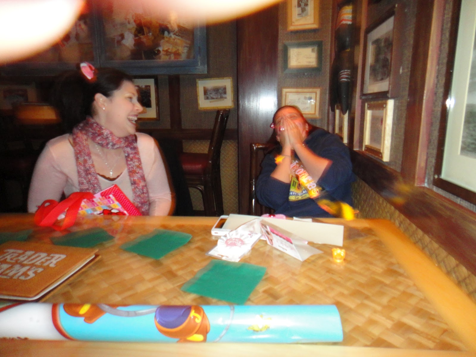 When I left off on my preview post, my friends had just surprised me by showing up at Trader Sams bearing gifts and donning Hello Kitty ears.