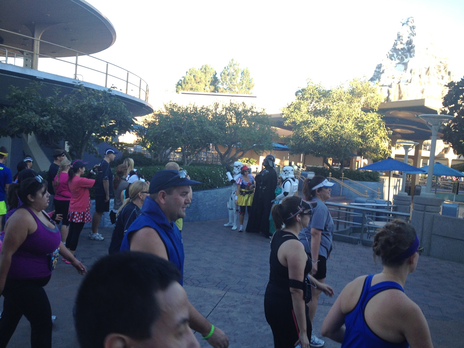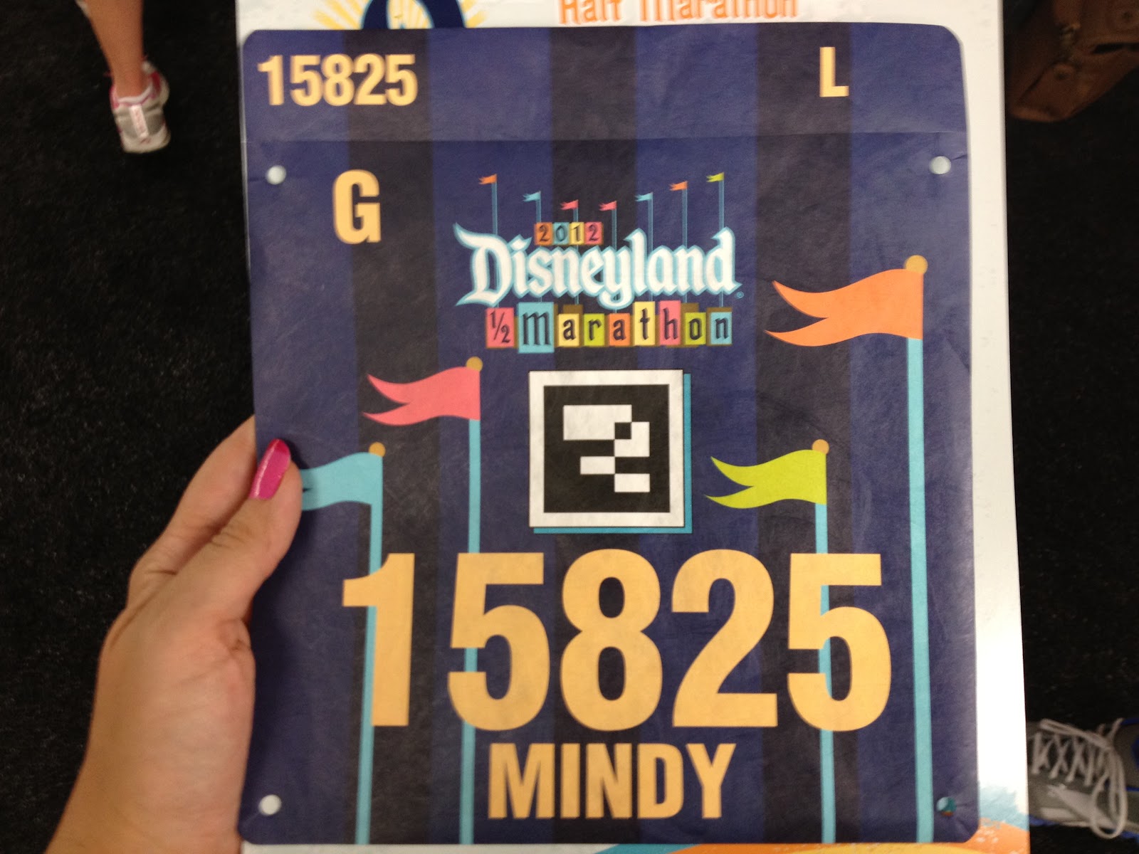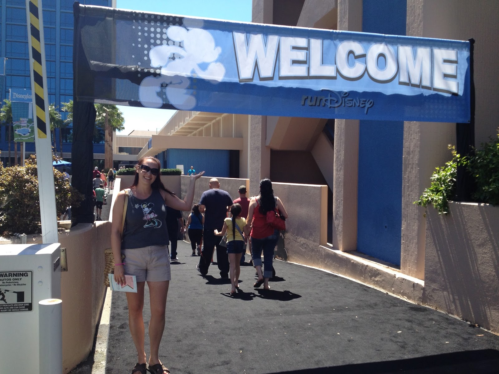 The weekend started on Saturday afternoon when we made our way down to Disneyland for the Health and Fitness Expo, where I needed to pick up my bib and other important race information. The expo was held at the Disneyland Hotel. After a bit of wandering and confusion, we figured out we needed to pick up my stuff “downstairs.” We followed a black carpet down a ramp into what is normally an employee parking area that was converted into race central.