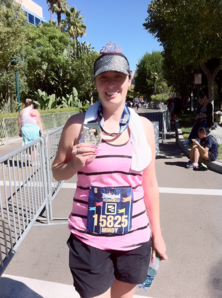 After a few minutes I forced myself up and continued on through a picture area where they were taking pro pictures of everyone with their medals, which are supposed to be available online next week. Then I looked for my last name letter group and once I walked through the tent, I saw Mr. BFT, Wendy, and her mom waiting for me. Gross hugs were exchanged and Wendy presented me with a little trophy filled with pink M&Ms! I had read somewhere that chocolate milk was good to drink right after a race for the protein so Mr. BFT had one waiting for me, which I chugged. Meanwhile he told me I made good time and read me my stats. I was so super happy that even with all my picture stops and my bum knee I came in under my goal of 15 minutes per mile! If I hadn’t of done my stiff leg running I may not have made it. Mr. BFT asked me what I wanted to do next and I said I wanted to get back to the hotel ASAP. We walked as a group through the closed off Downtown Disney parking lot back towards the Disneyland Hotel. We parted ways with Wendy and her mom who were parked at the hotel. I felt bad that they basically stood out in the sun to see me walk by for a few seconds but they said they understood. It was so sweet of them to come cheer me on and such a major surprise!!
