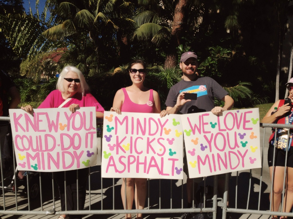 Just past the Mile 13 marker we were back on Disney property at the Disneyland Hotel. I started looking out for Mr. BFT because he told me he would be waiting for me somewhere near the finish line. I rounded a corner and was totally shocked to see him with my friend Wendy and her mom holding giant signs with my name on them!