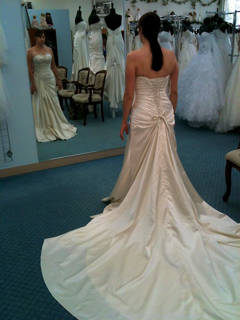 (This is really round five, but I couldn’t take any pictures at the fourth shop I went to, where I tried on six gowns. So just play along, okay?)