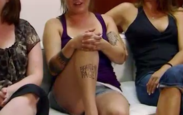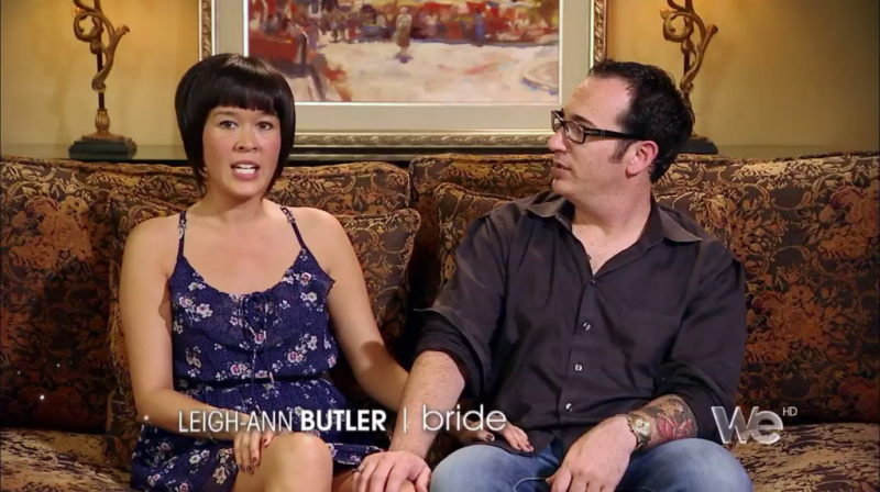 After the Table ‘O Stuff, David sends Jared packing and we move on to bridesmaids. Leigh-Ann explains that she asked all her bridesmaids to wear whatever they wanted. Jared’s sister comes out in this: