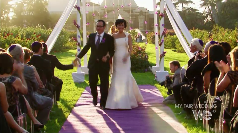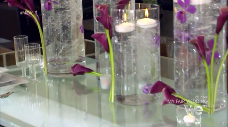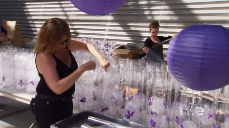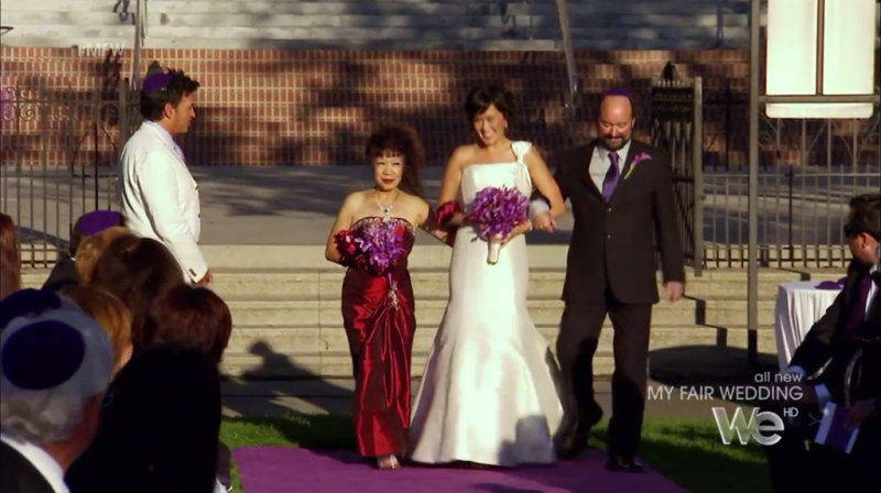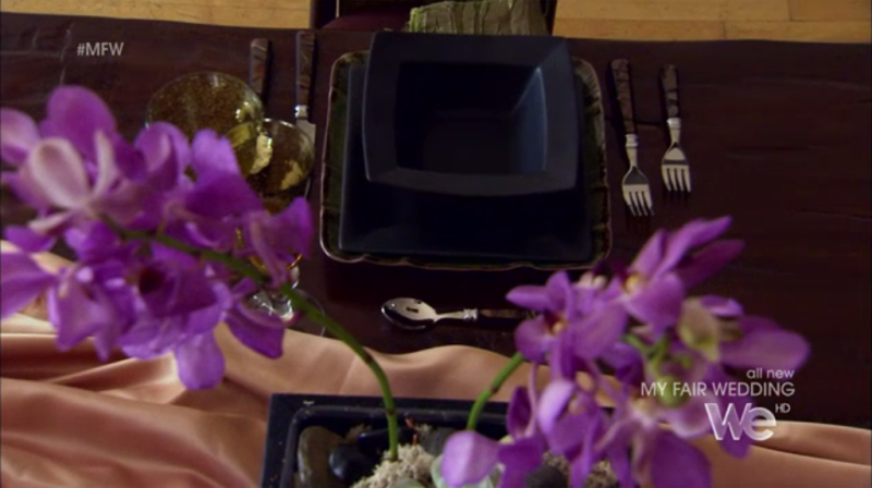 The bride wants an Asian themed wedding but also needs to incorporate Jewish tradition. The groom wants a modern Zen wedding. The bride tells a lovely story about how Jared sent her purple orchids after they first started dating, and she was trying to incorporate them into the wedding decor.