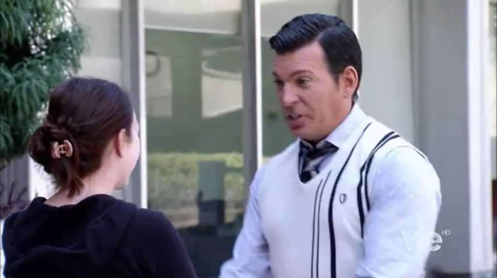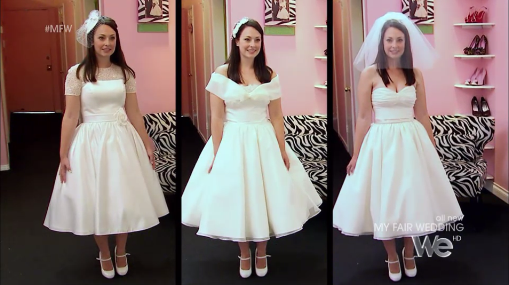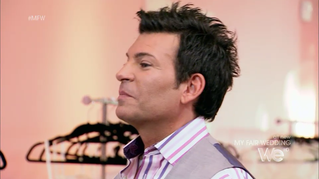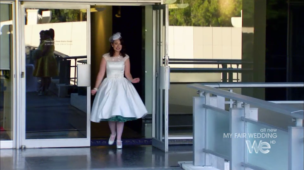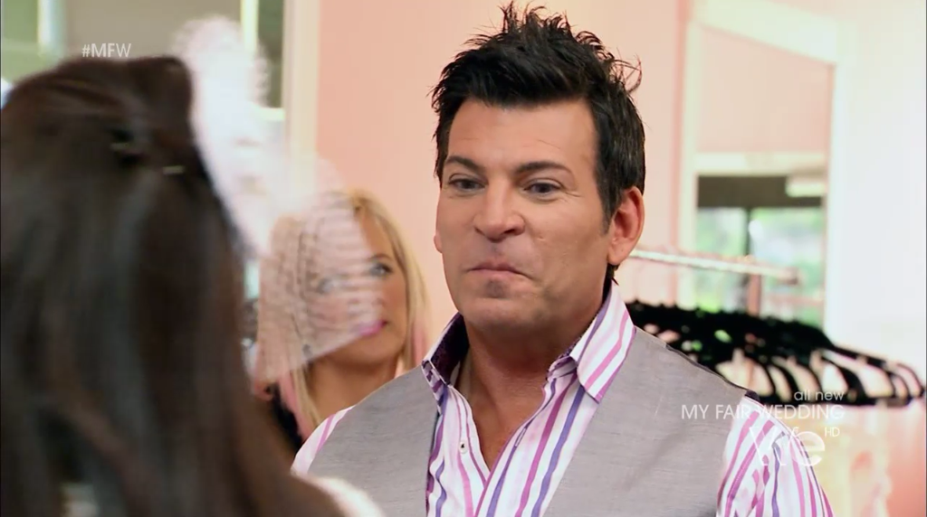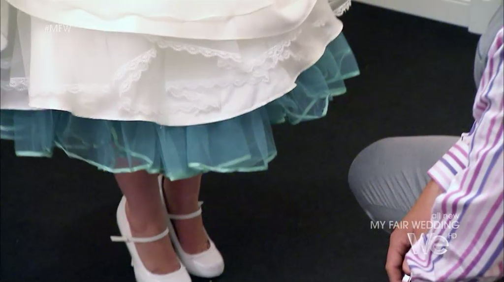 There is nothing I personally don’t love about this look, from the birdcage fascinator to the Mary Jane pumps. The bride loves it too, but asked about turning the sleeves into cap sleeves, which David asks Dolly about, and Dolly confirms they could make the change. (Foreshadowing.)
