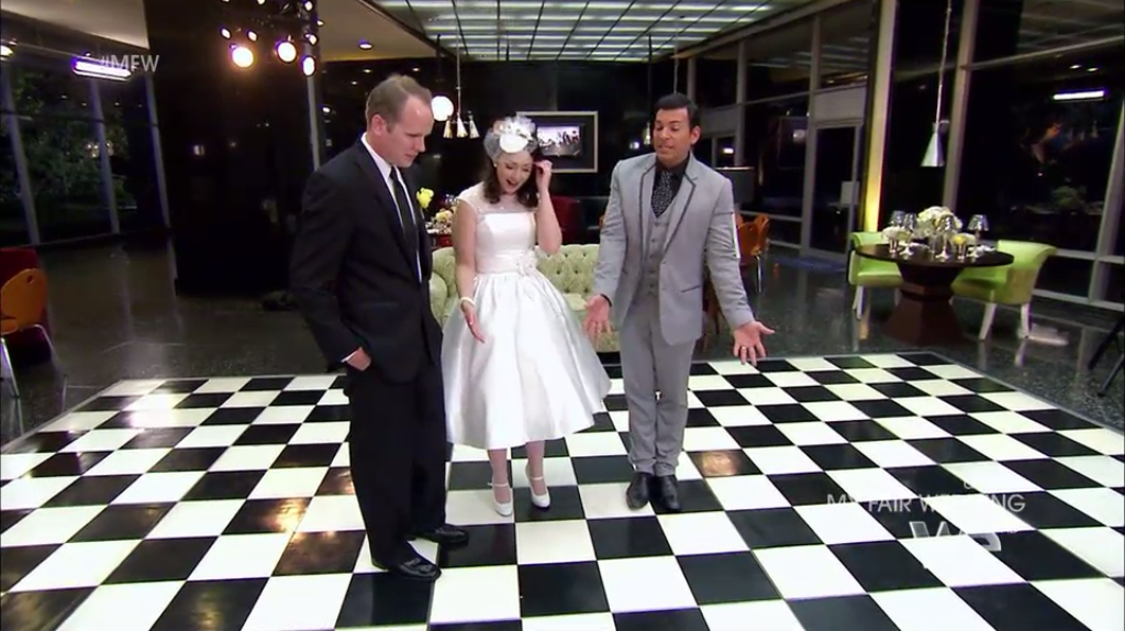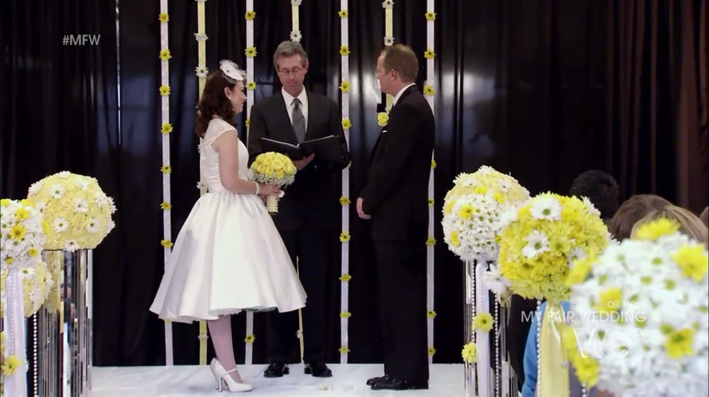 As the couple is doing their intro, I notice that there doesn’t seem to be anything … wrong … with their wedding plans. There’s no missing venue, no deceased relatives, no debilitating disease. Hmmm.