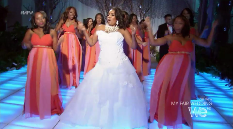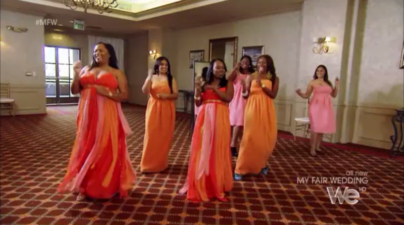 The bride explains she and her bridal party are doing a dance at the reception called The Wobble, and these dresses are great The Wobble dresses.