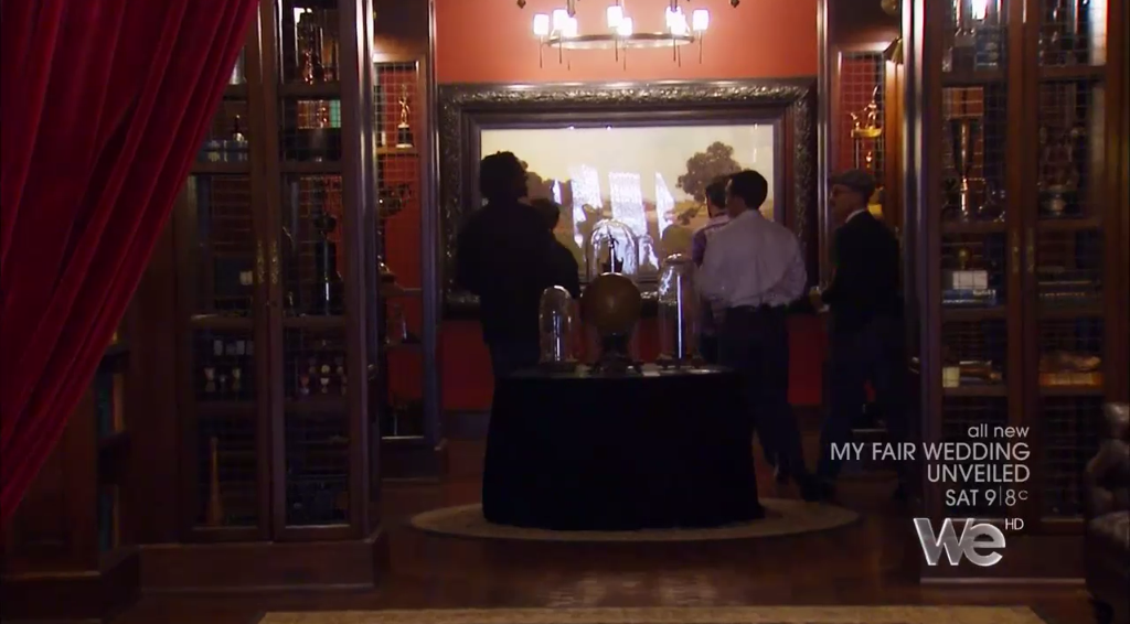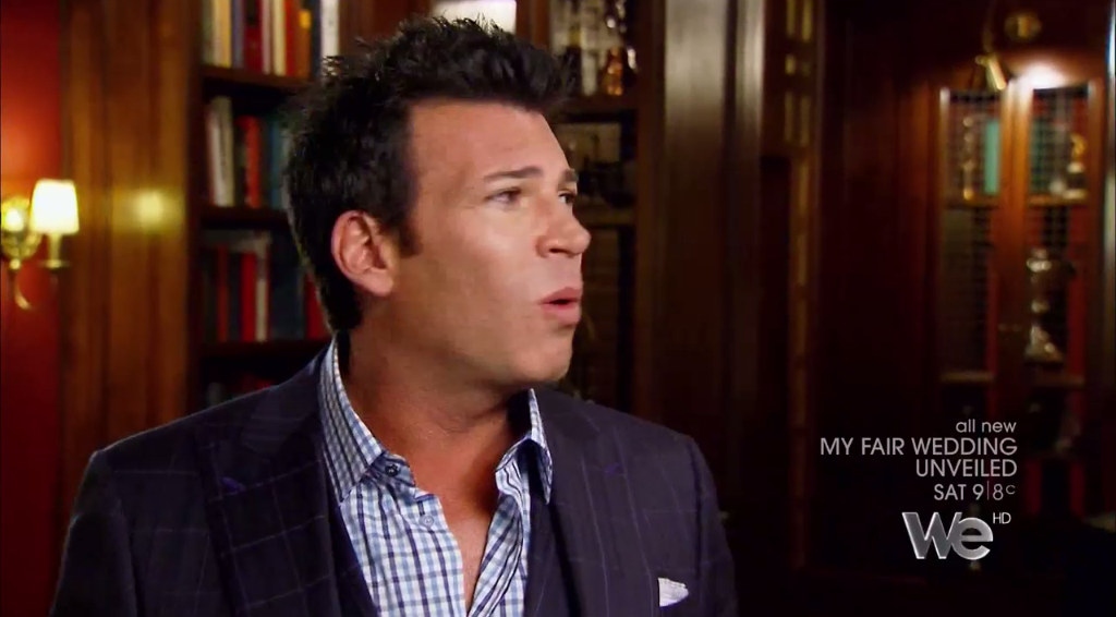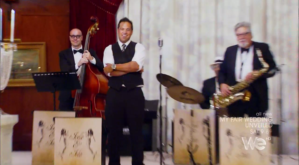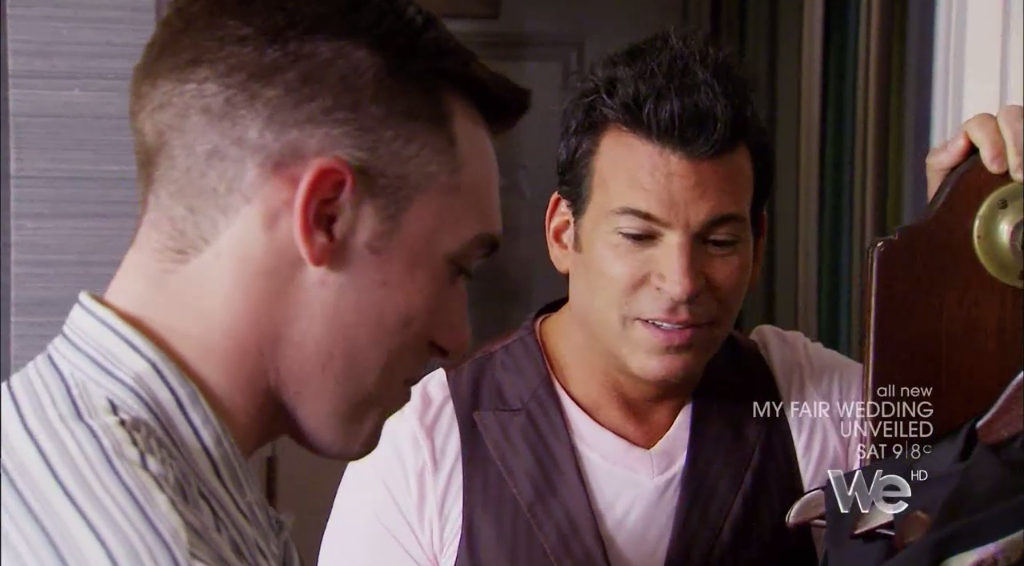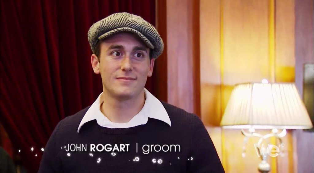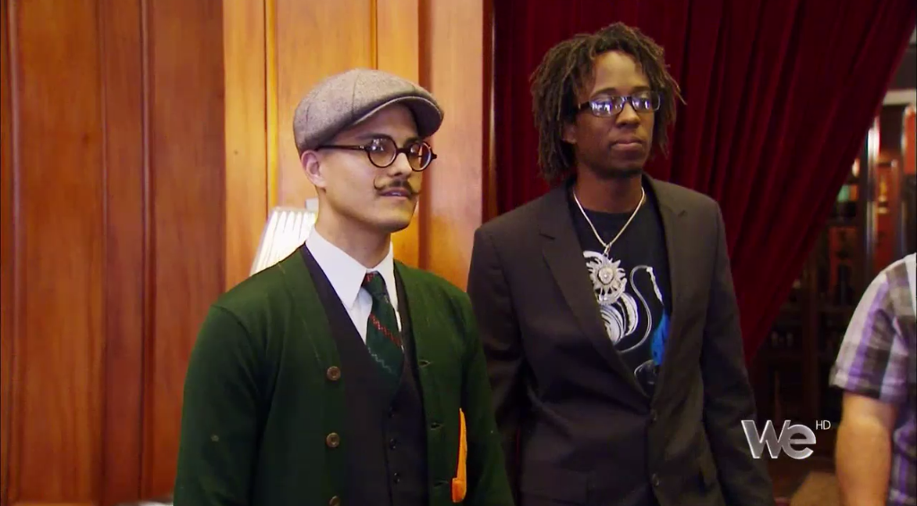 Next we see David talking with the groom and his groomsmen, and David realizes this 1940s thing the groom has going on is NO JOKE.