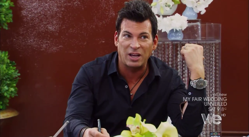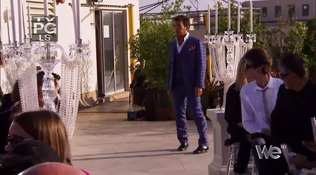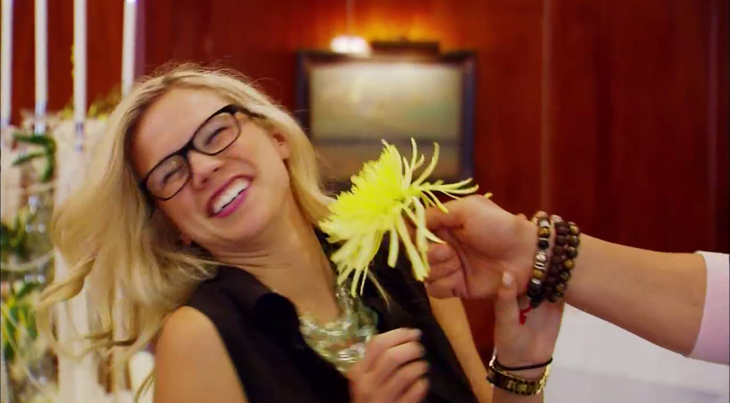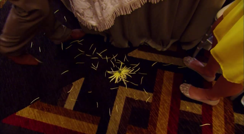 With a spider mum. Â David talks about how his dad ran a funeral home (???? and also !!!!) and David thinks spider mums are “funeral flowers.” Â He then forces the blond Tuteraette to smell it and demands her to say it smells like a funeral.