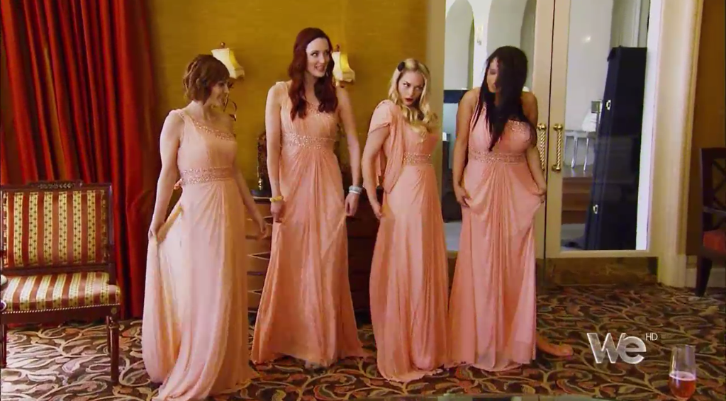 The bride’s sister makes a joke about the dress and the room concurs.