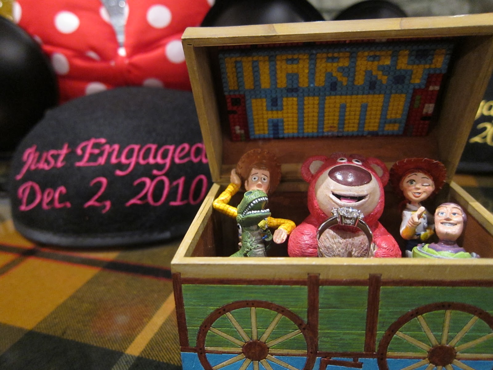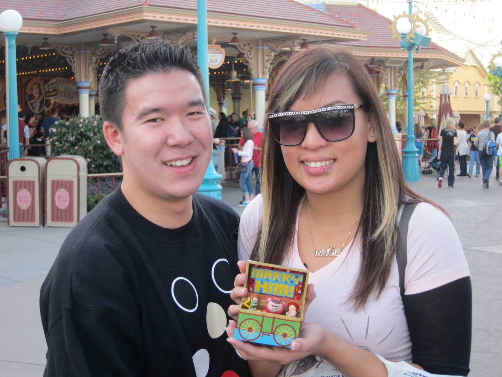 Fast forward four years to December 2, 2010. I am a HUGE Disney fan and Calvin, like the trooper he is, has joined me in my love for Disney. He decided to take me to Disneyland for my birthday along with two of our friends. The two of us started our day with breakfast at Storytellers Café and then met up with our friends in Disneyland. Shortly after we entered the park, Calvin said that he needed to do something and he’d be right back. My friends and I headed to Big Thunder Mountain Railroad and once we were off the ride, my friend hands me a card. The envelope was titled “Disney Challenge.” My friends said to open the card and would not give me any other information. I couldn’t stop smiling but was really confused. What Calvin had did was set up a scavenger hunt with challenges based upon our many previous trips to Disneyland. He picked certain highlights from each trip and sent me to each place where another clue would be waiting. In the end, I was reunited with my love at Disney’s California Adventure. The last clue sent us to our favorite ride, Toy Story Mania. As we walked to the line entrance, Calvin was acting weird and kept walking behind me. At first I assumed the scavenger hunt was just something sweet he did for my birthday, now I was started to get suspicious and nervous. Sure enough, he stopped me and started to tell me how much he loved me. I quickly caught on as to what was happening and my heart began to beat faster and faster. He then started to grab something from his pocket and slowly got down on one knee. Tears immediately started streaming down my face. There he was, my prince charming on one knee with a custom made Toy Story 3 ring box. In the box, my favorite character from the movie, Lotso, was holding my custom made Mickey Mouse engagement ring. I immediately nodded yes, as I was too choked up to say it, and gave him a big hug. As we embraced, I will never forget what he said. He said, “ Don’t worry, babe. I will take care of you.” (I am tearing up as I write this!) [ed. note – Me, too!]