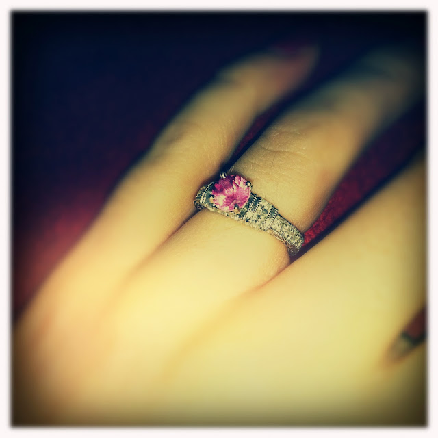 The day started out perfectly. We had Mickey waffles at the Carnation Café and got right on to one of our favorite rides –Haunted Mansion Holiday. Paco suggested we go on The Mark Twain Riverboat next and we walked on just as it was taking off. It was still early so we had the whole 2nd deck of the boat to ourselves. I was busy taking it all in and Paco asked if he should take some photos. He was missing some exciting things as he was digging in our bags for the camera so I kept pestering him to look here and look there. I couldn’t figure out what was taking him so long until I looked down and was shocked to see him on one knee with a gorgeous pink sapphire ring. It was a total surprise and so perfect! We just hugged and smiled (and I cried… a lot) for the rest of the boat ride. (Ed. note – Pink sapphire engagement rings FTW.)