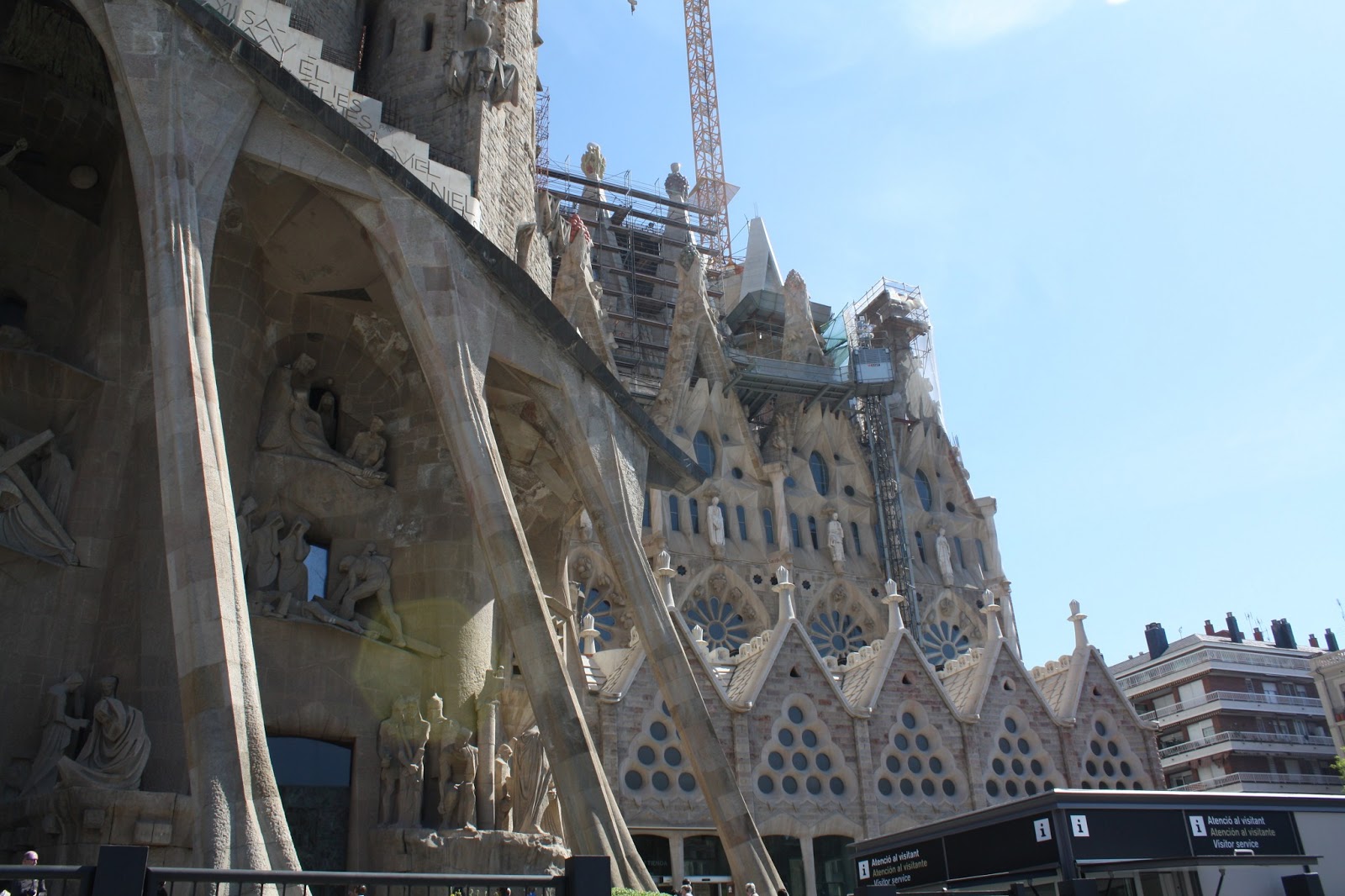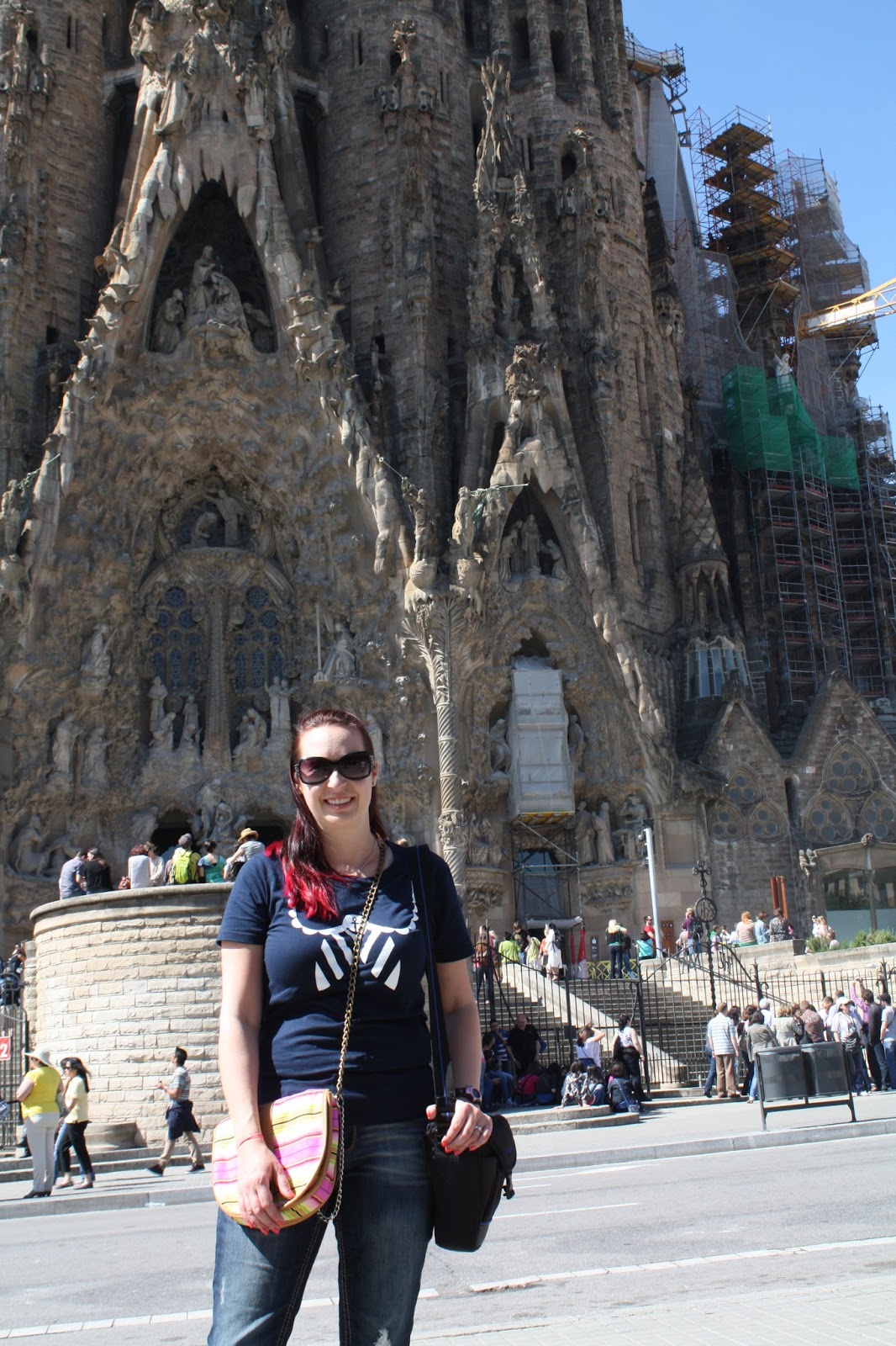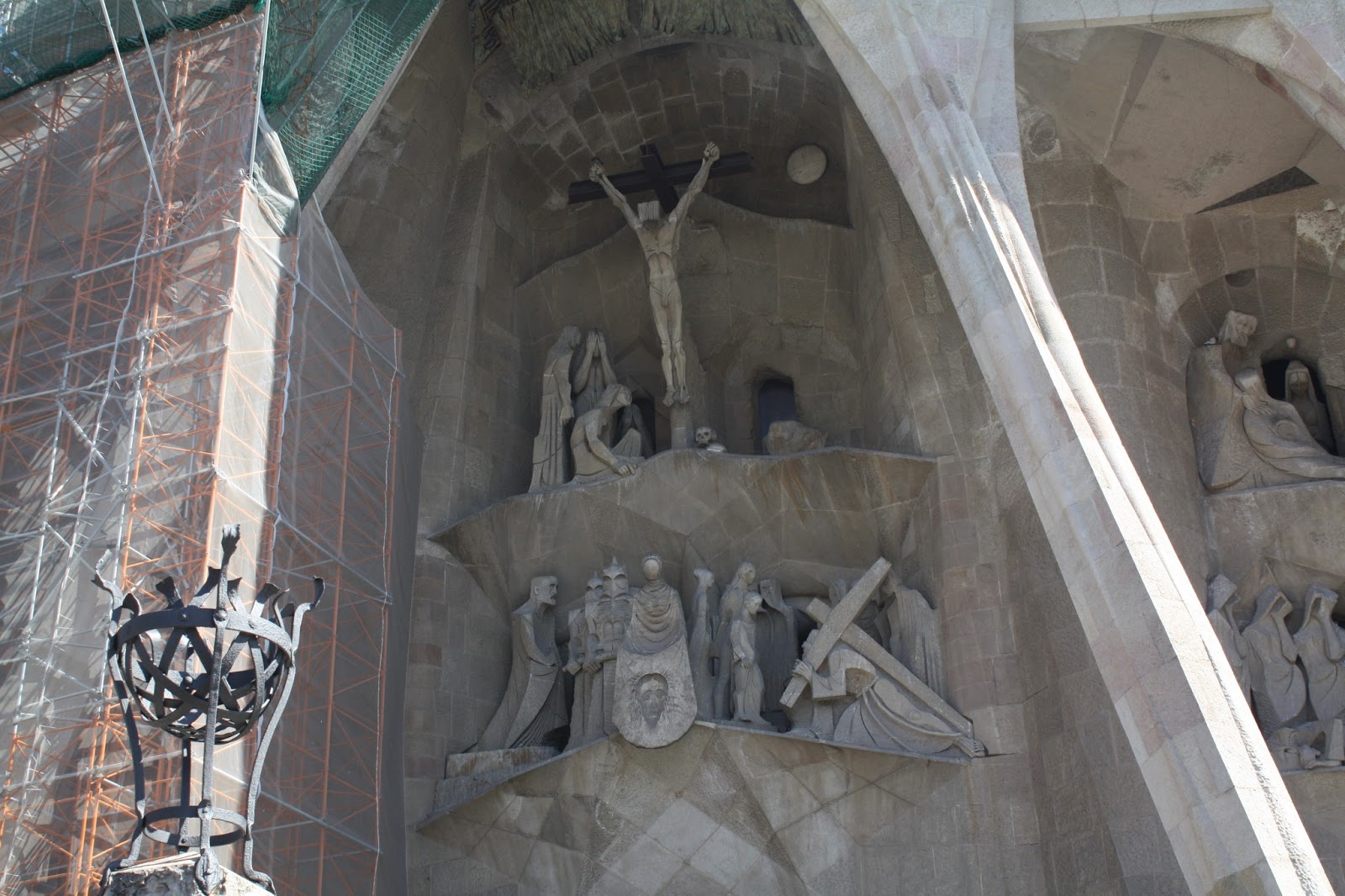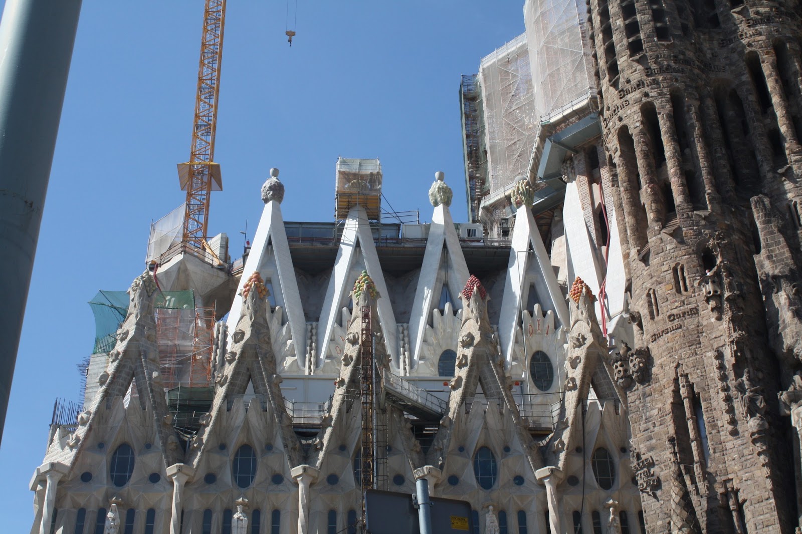 Our first stop on the metro line was La Sagrada Familia. La Sagrada Familia is a large (impossibily large) Gothic style church designed by Gaudi, who died in the 1920s before it was finished. The church is still under construction and won’t be finished for several more years. It’s so impressive and breathtaking. I took a lot of close-ups but we didn’t have time to walk far enough away to get a full shot of it. Luckily there are plenty on the internet, if you are interested in seeing it. I hear the inside is beautiful, but we didn’t have time to wait in line for a ticket, given everything else we wanted to see.