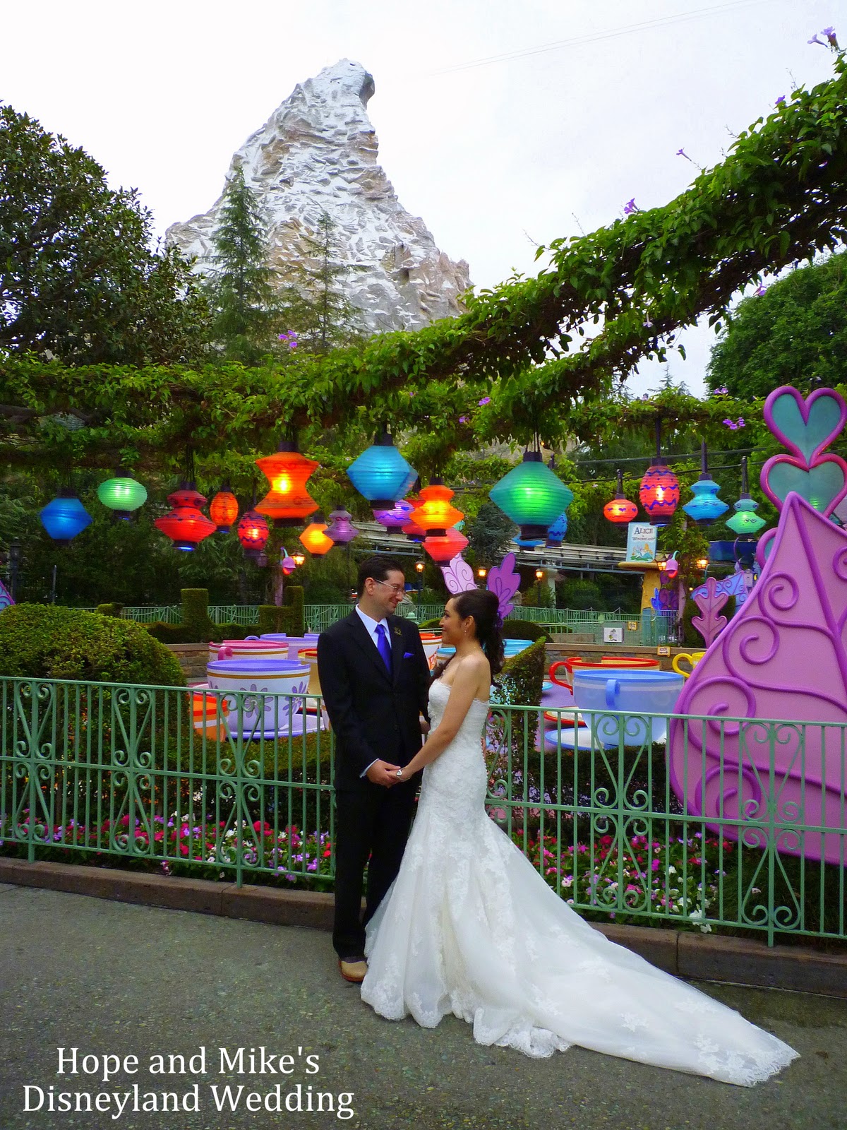 Today we have a guest post from Disneyland Bride Hope. Hope and her husband were married at the Disneyland Hotel in 2010, and one of their favorite memories is their early morning in-park photo shoot at Disneyland. One of the amazing perks of getting married at a Disney resort is the ability to do a private photo shoot at Disneyland or the Magic Kingdom, and it is often a decision the couple must weigh heavily, due to the costs involved and the sometimes unpredictable restrictions levied by the park management. But those who are able to afford this experience say the memories are worth every cent. Here is what Hope has to say about their early morning Disneyland wedding photo shoot.