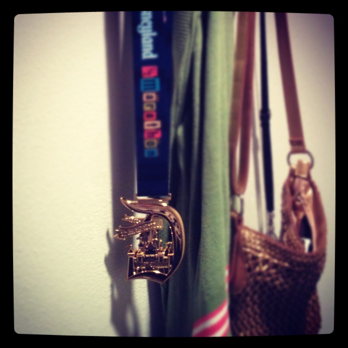 - Be proud of your bling. After my first Disneyland Half Marathon, I wore my medal for a week. I wore it during the car ride home and I slept with it next to me on the nightstand. Even the next day when I was laid up on the sofa with a million ice packs on my legs, I wore my medal. Now it hangs in my apartment entryway so I see it every day.