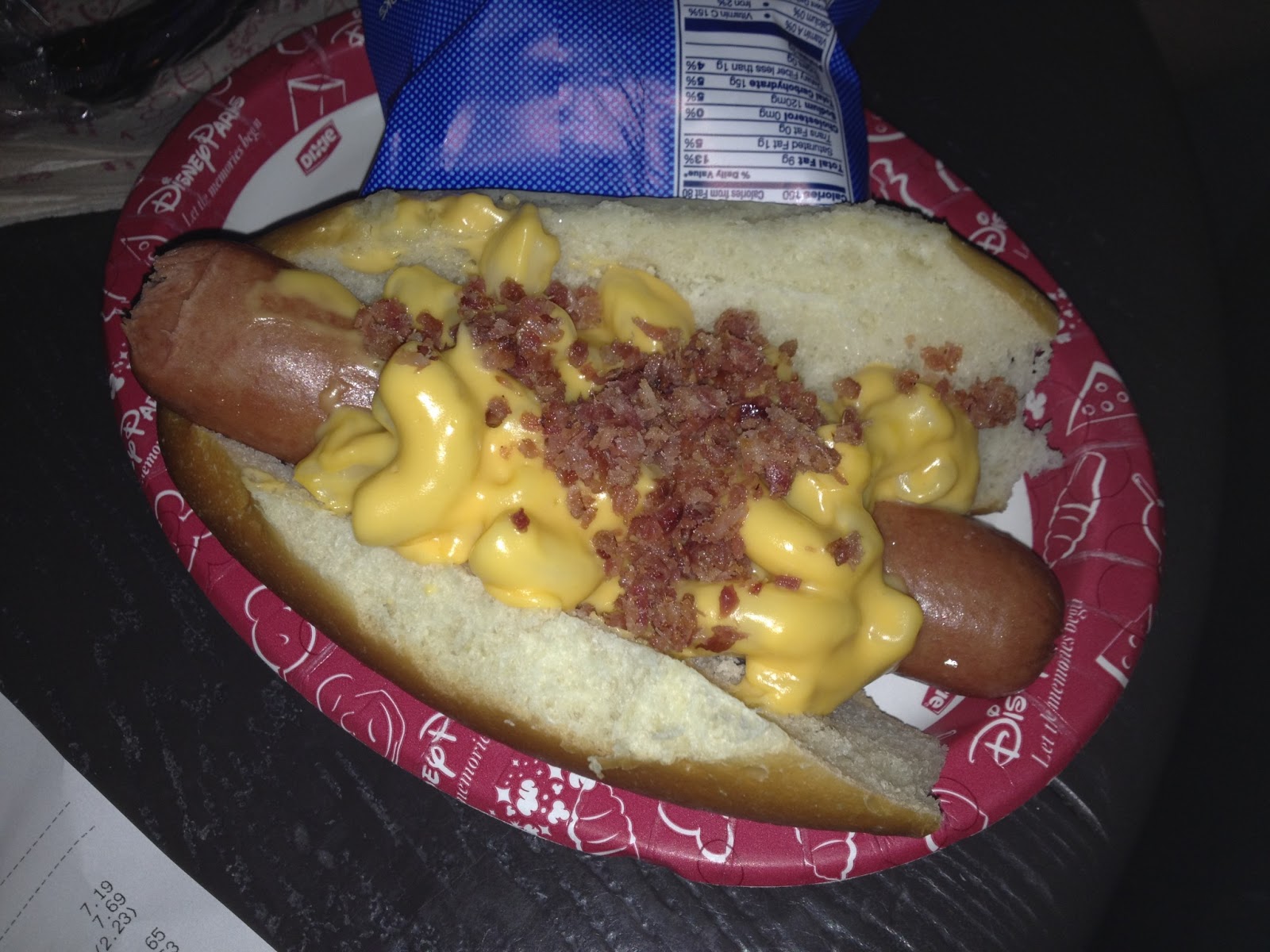 I think the Fantasmic Party started around 8pm. A few attractions were open in Adventureland and Frontierland, so even though it was a small crowd, those lands were still packed and there were long lines for everything, including the special bacon mac n’ cheese hot dogs that I just HAD to try: